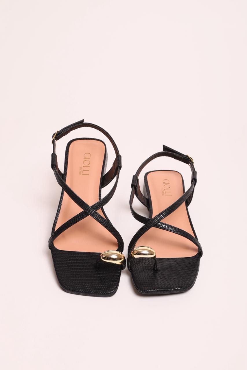Rasteira em material tecnológico cor textura em lezard preto, possui um metal dourado no dedão. Salto 1,5 cm, tornozeleira com ajuste.