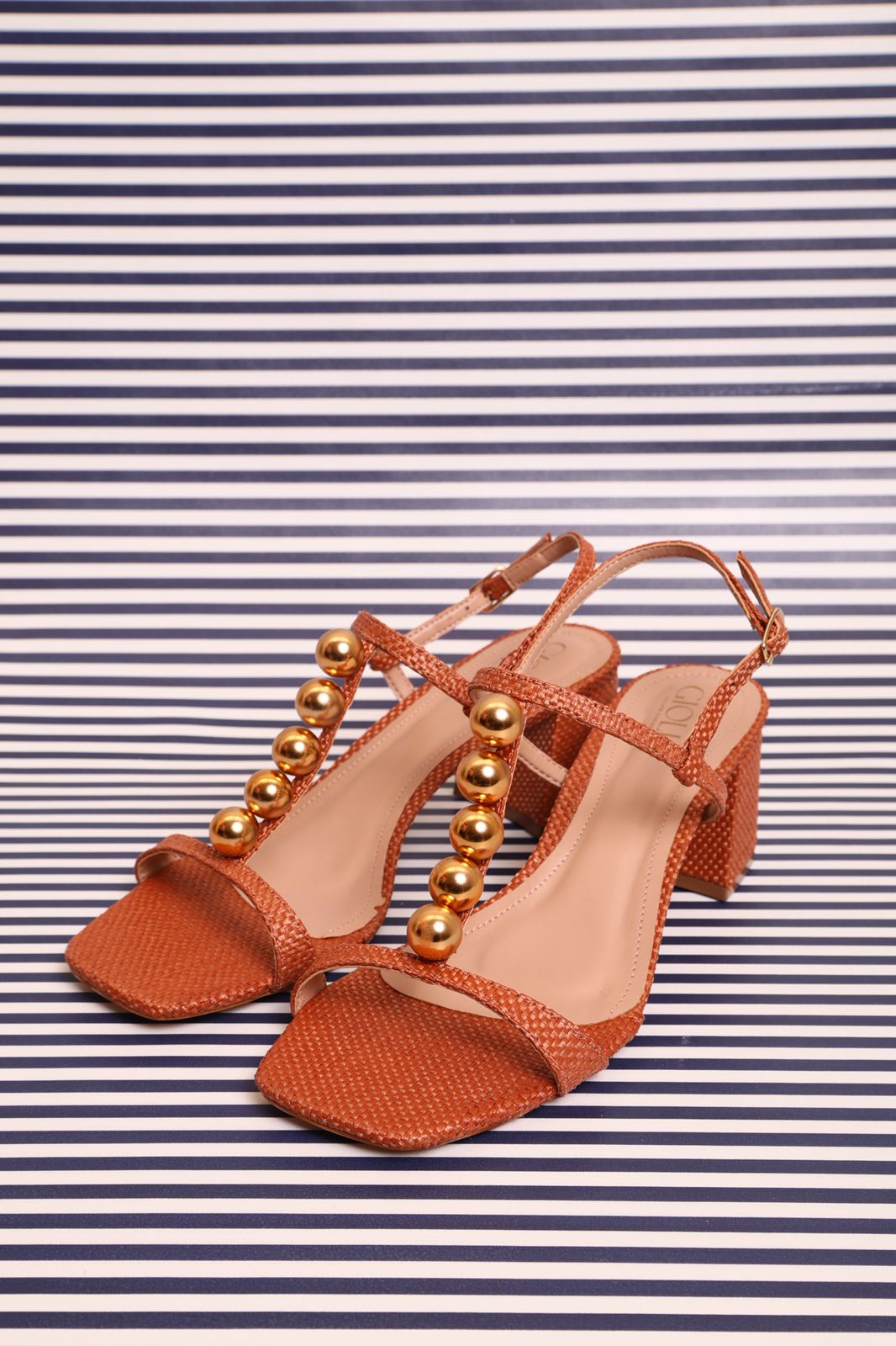 A sandália apresenta um design moderno e sofisticado, combinando textura, brilho e conforto. Produzida em material com acabamento texturizado em tom terracota, ela possui tiras finas que valorizam o pé e garantem leveza ao visual. O grande destaque é a aplicação frontal de esferas metálicas douradas, que criam um efeito glamouroso e elegante.