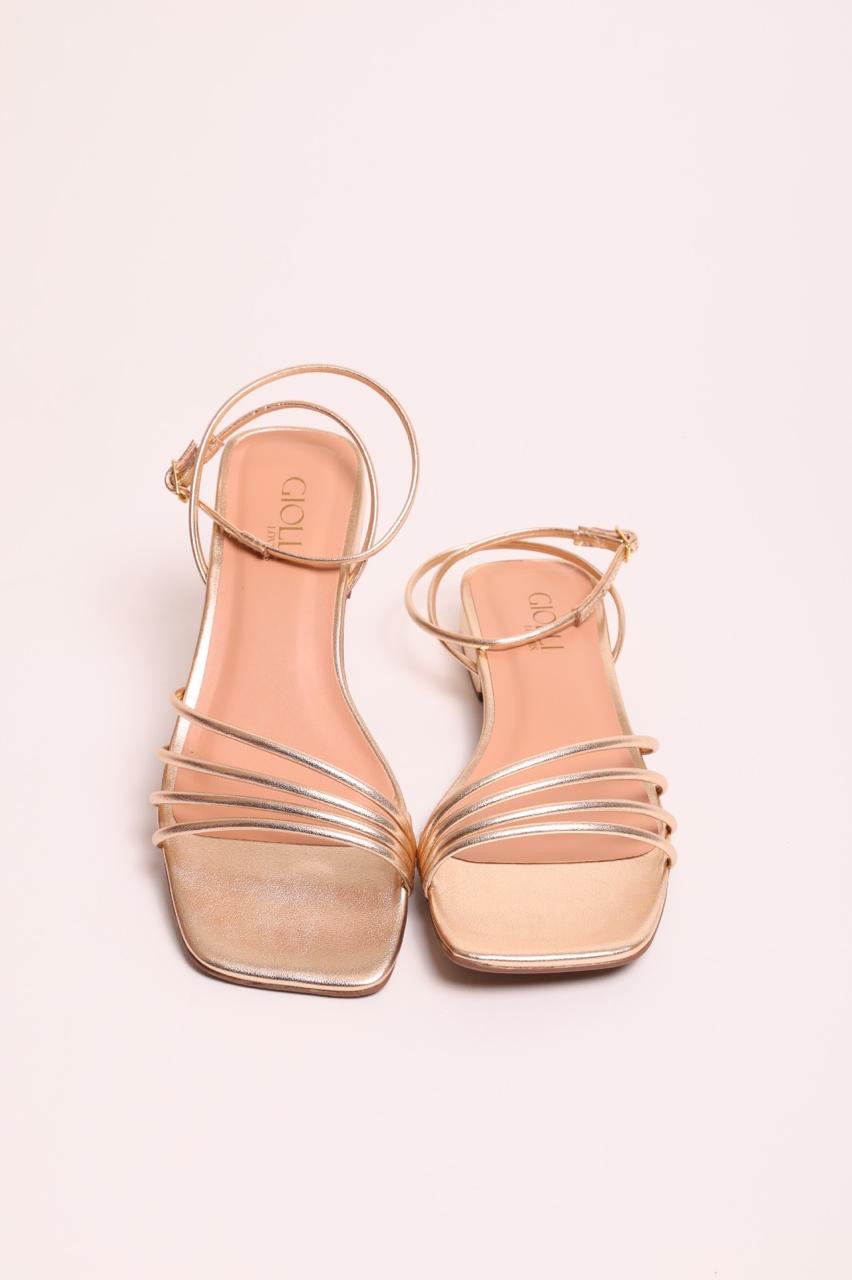 Rasteira em material tecnológico metalizado dourado, com tiras finas macias. Possui solado emborrachado com salto de 1,5cm e tornozeleira ajustável.