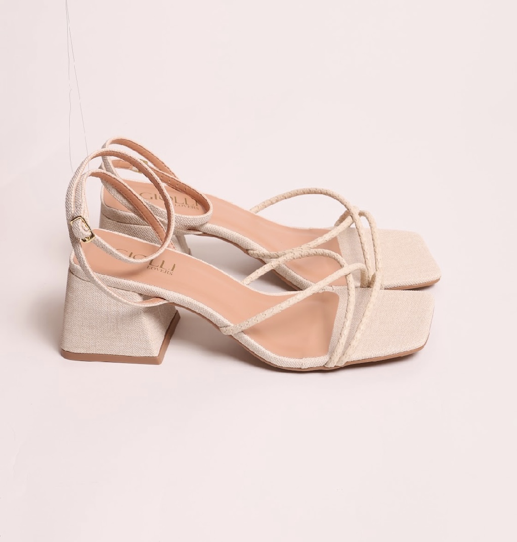 Sandália salto bloco com 5cm, material tecnológico e detalhes em linho off white.