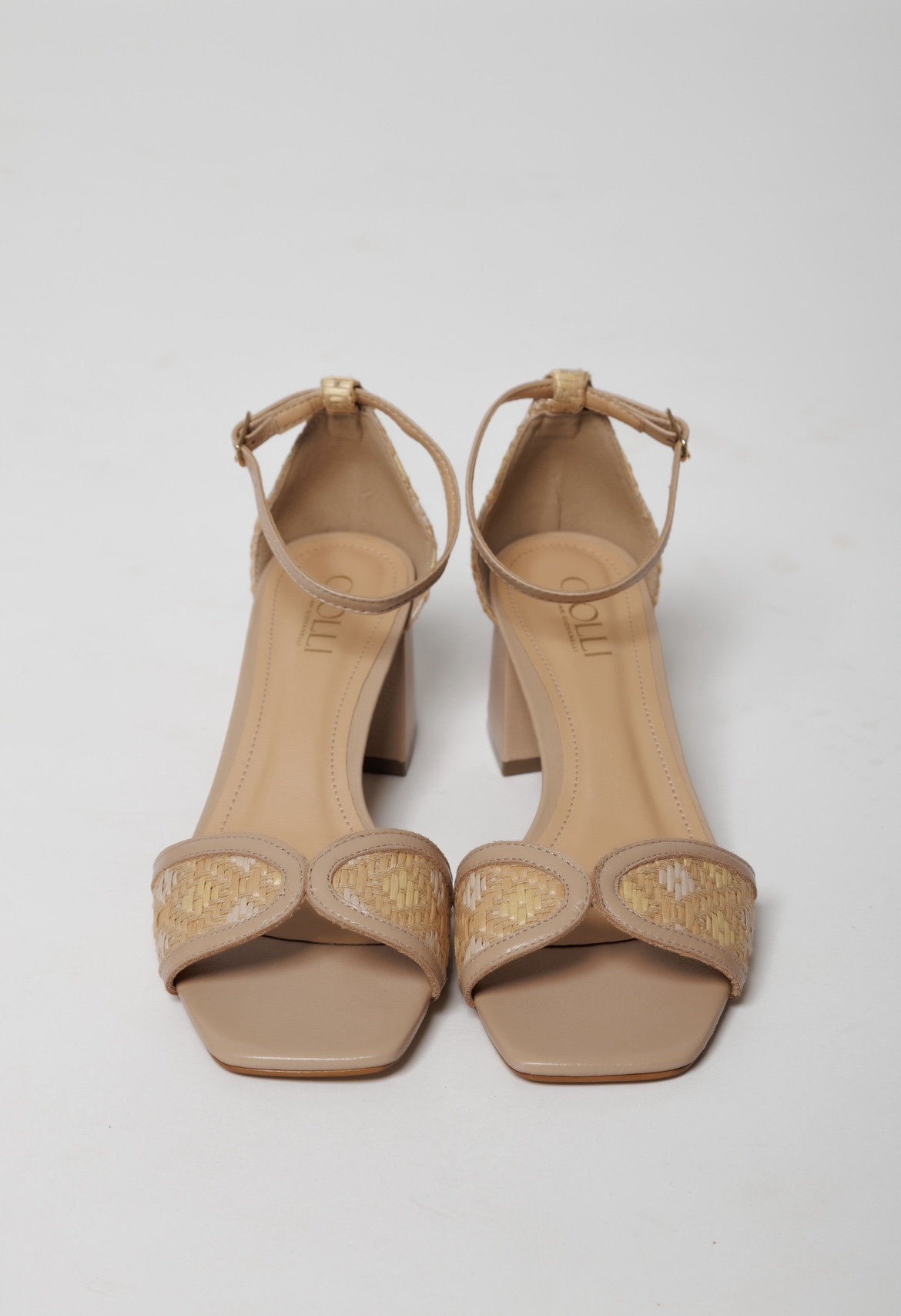 Sandália em ráfia com detalhe em couro Nude, salto bloco 5cm. Possui 2 opções de tornozeleira sendo uma delas de amarrar na perna e com acessório especial de concha.