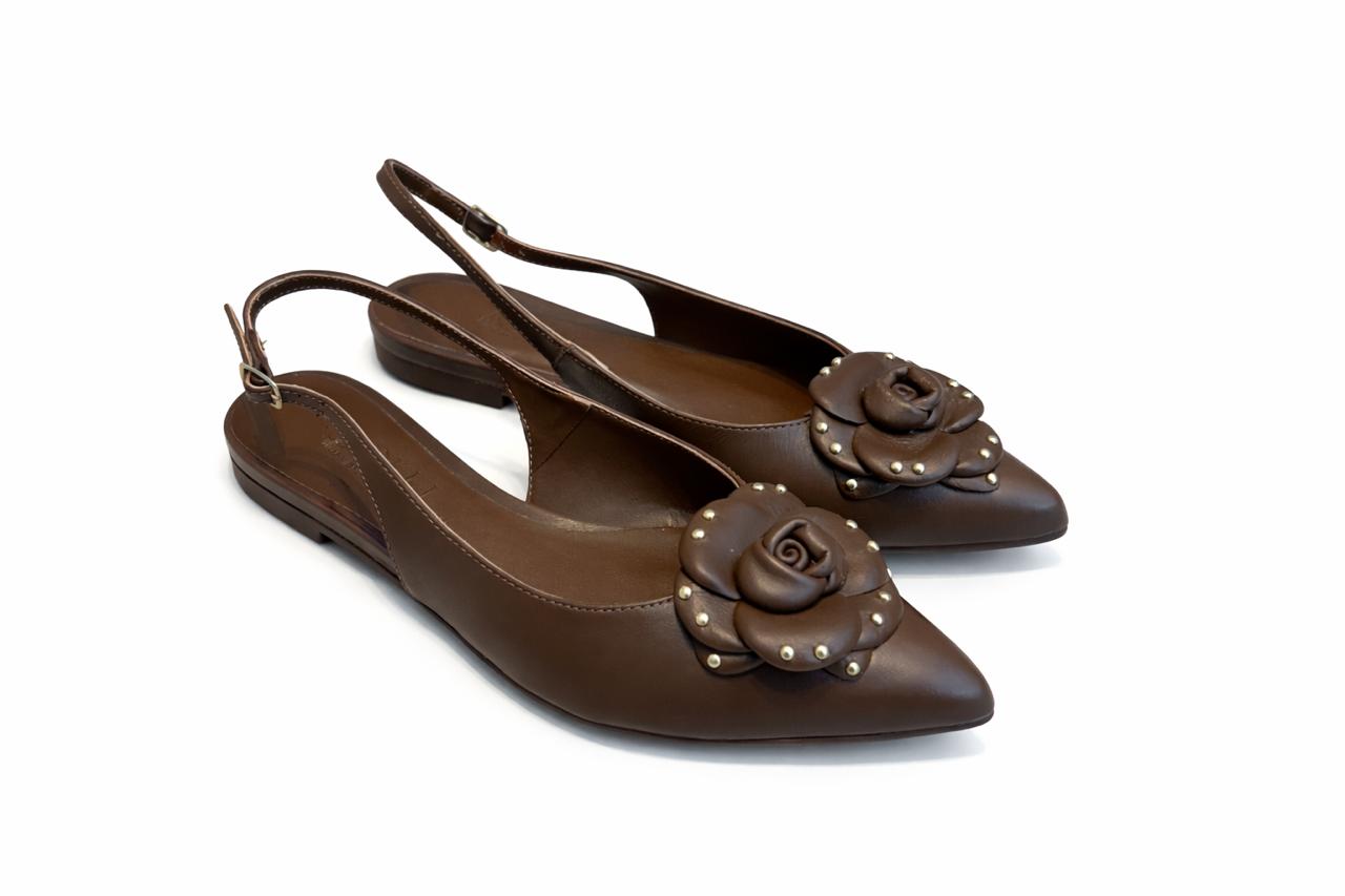 Sapatilha slingback em couro legítimo com bico fino, tiras ajustáveis no calcanhar e aplicação artesanal de flor 3D em couro com tachas metálicas douradas.